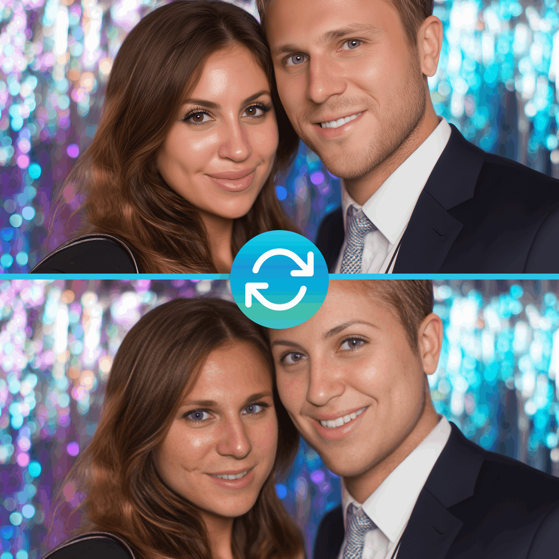 Oubliez les simples filtres. Grâce à l'Intelligence Artificielle, transformez instantanément vos invités en œuvres d'art, héros de cinéma ou voyageurs temporels.